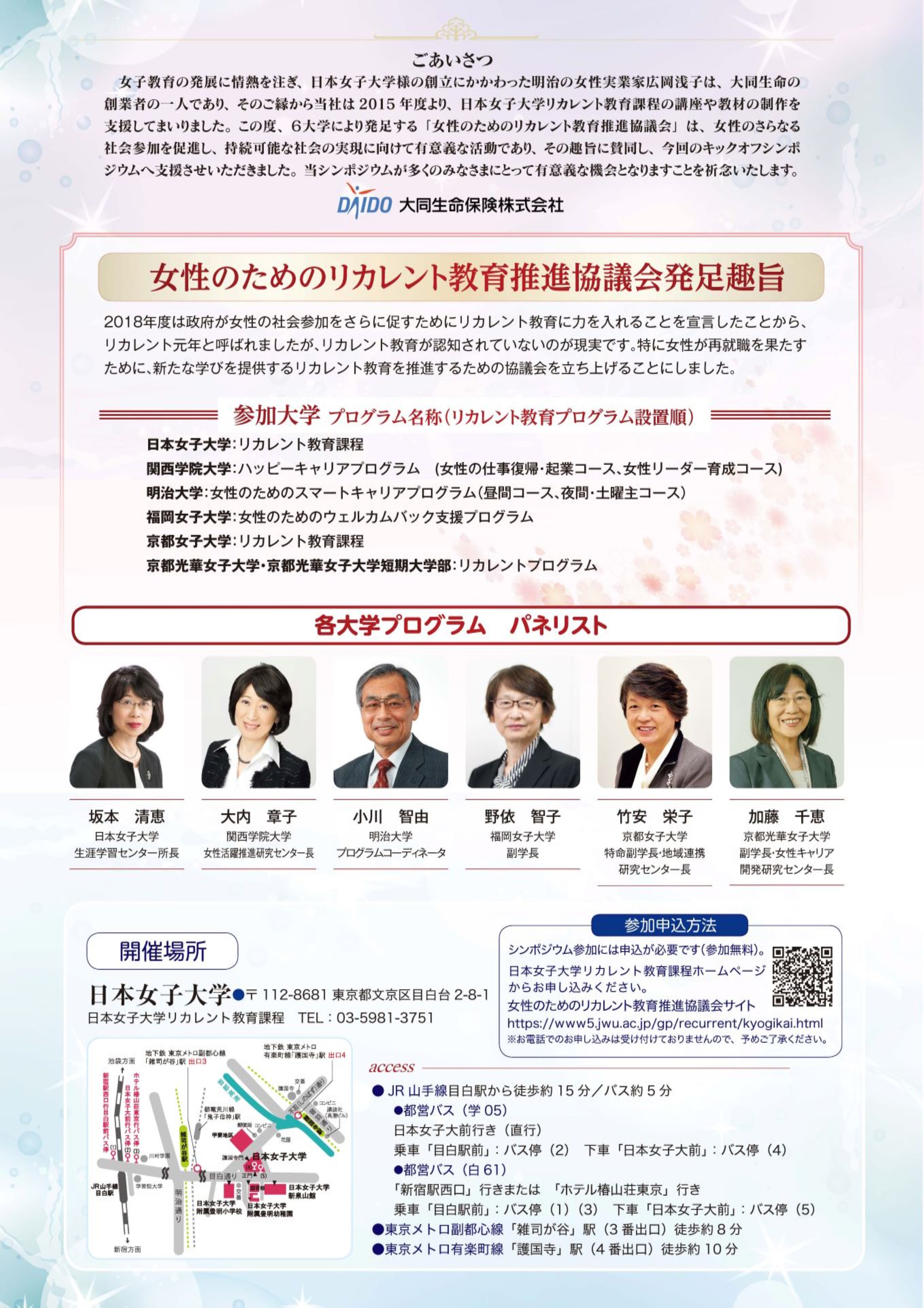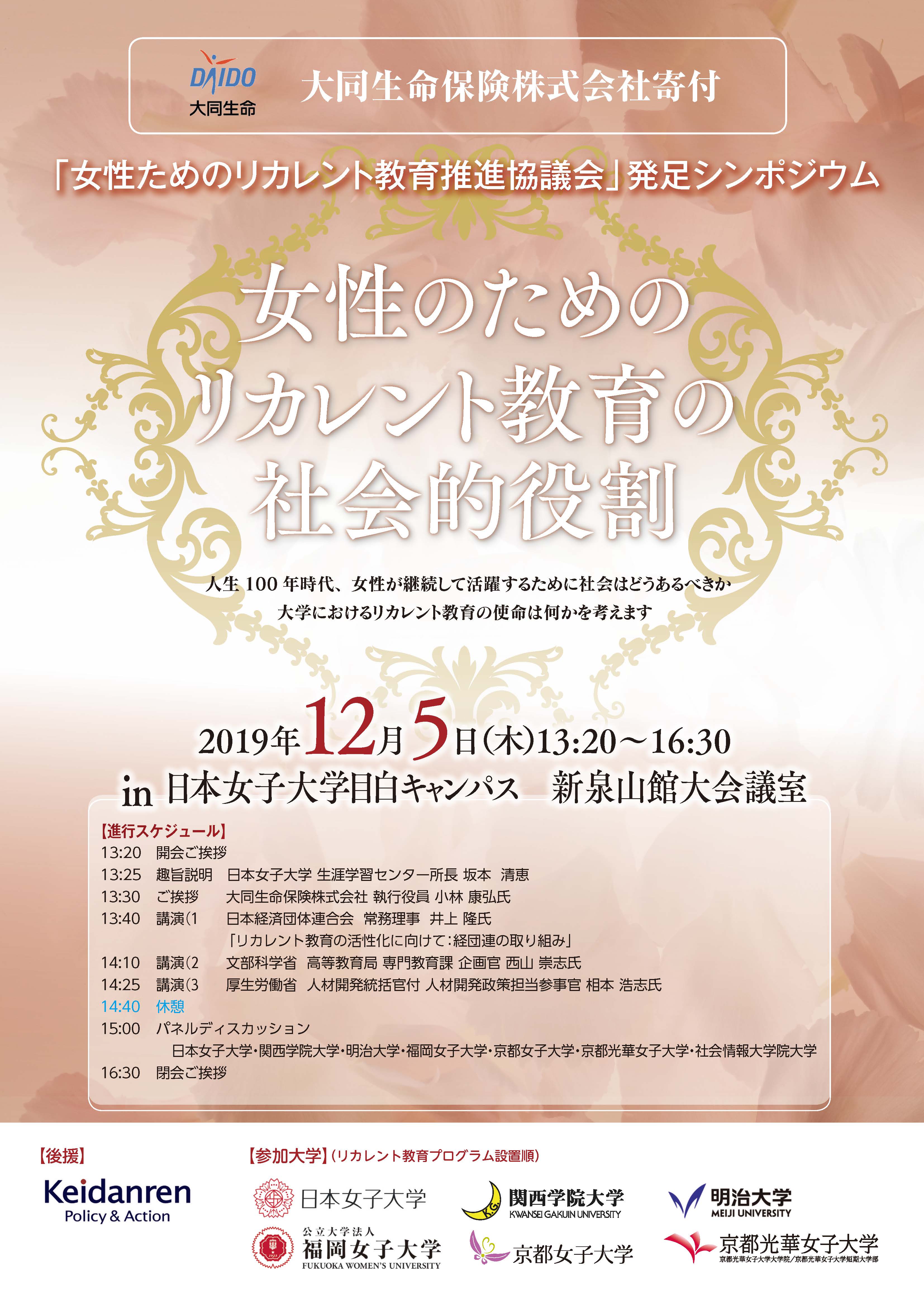 大同生命保険㈱のご寄付によるシンポジウム第1部では、リカレント教育の発展に向けて日本経済団体連合会、文部科学省、厚生労働省の講演、第2部では6大学がリカレント教育の現状の報告と課題などをパネルディスカッションしていきます。本学からは大内章子教授がパネリストとして登壇いたします。
