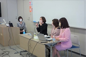 ハッピーキャリアのメンターや、授業でお世話になっている、オフィスKITO代表 伊藤久美氏、積水ハウス株式会社執行役員 河崎由美子氏、西日本電信電話株式会社ESG推進室長 横田さくら氏をお招きし、コーディネーターは大内章子先生が担当して、第1部ではパネルディスカッションが行われました。