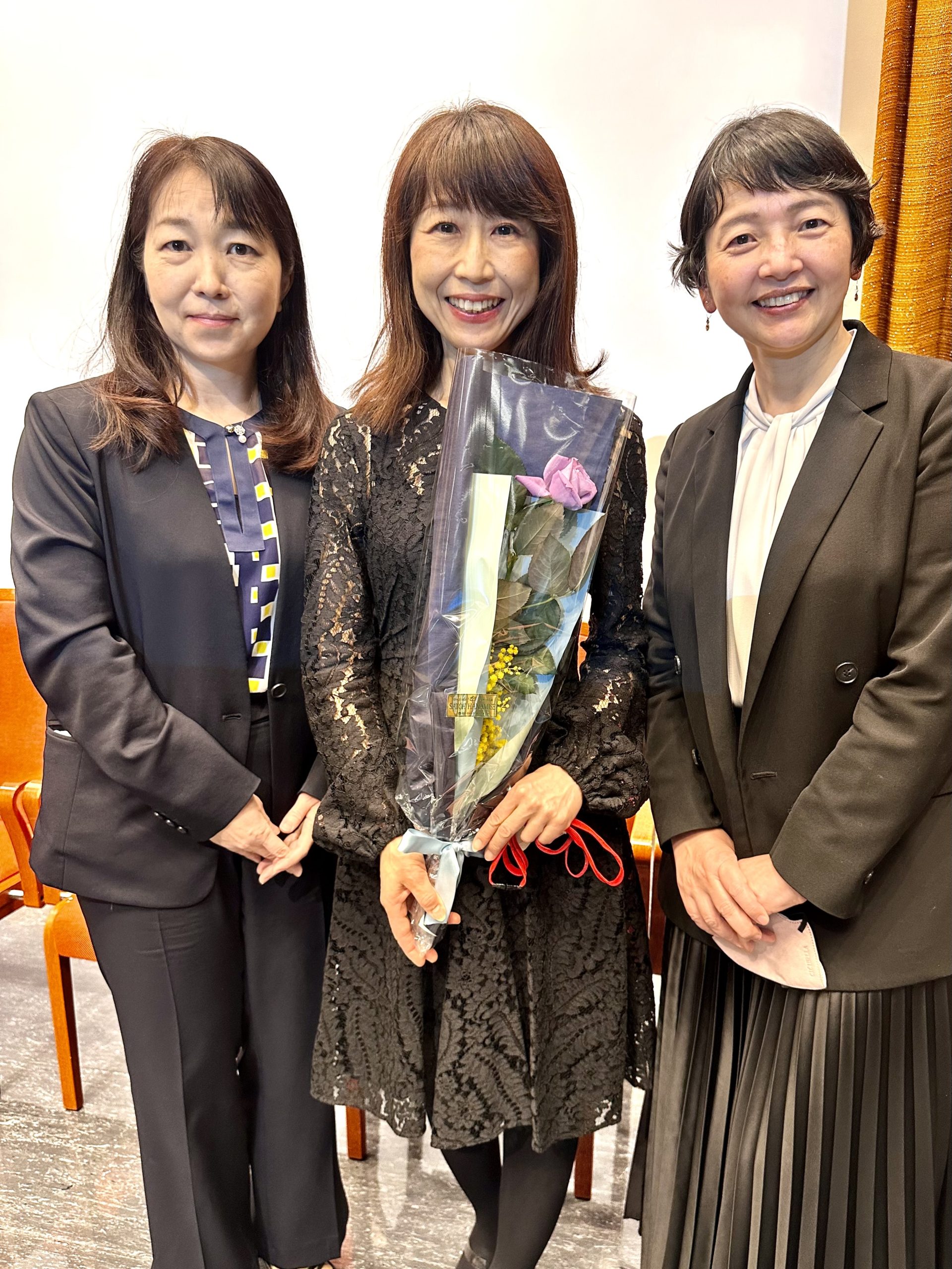 岡下さんは、大阪サクヤヒメ賞(活躍賞)の第1回受賞の藤田朋子さん(リーダー3期生)にぜひ応募してみたらどうかと声をかけてもらったことにより、ブルーローズ賞に応募することになったそうです。ハッピーキャリアでの期を超え、コースを超えたネットワークがなければ受賞することもなかったのです。授賞式には第5回受賞の高島公美さん(リーダー3期生)も参加し、3人の笑顔の写真が素敵なご縁を表していますね。おめでとうございます!