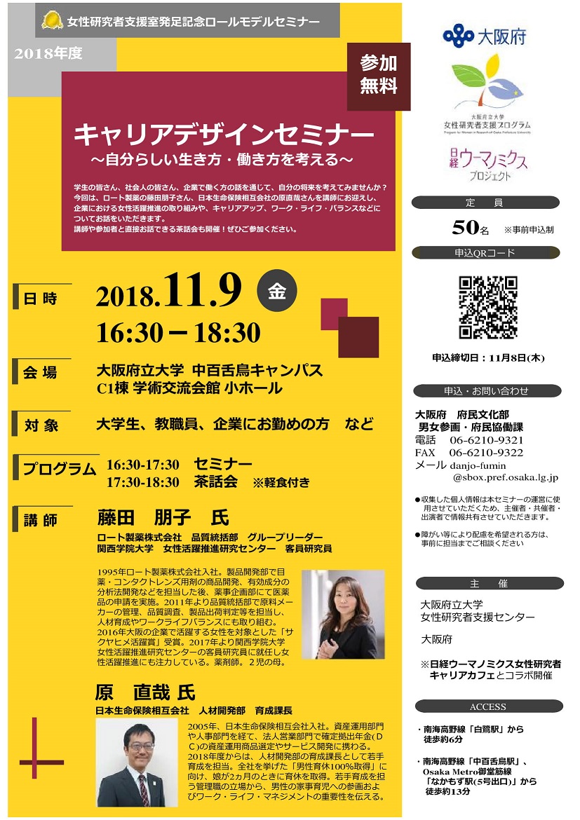 2018/11/9に研究員の藤田朋子が女性研究者支援室発足記念ロールモデルセミナーに登壇します。