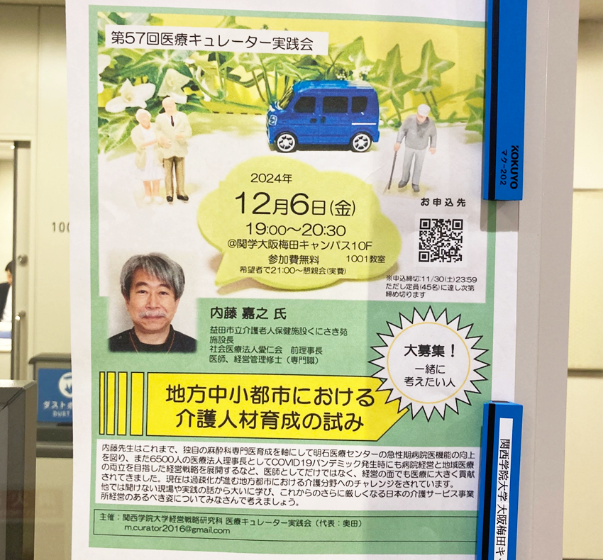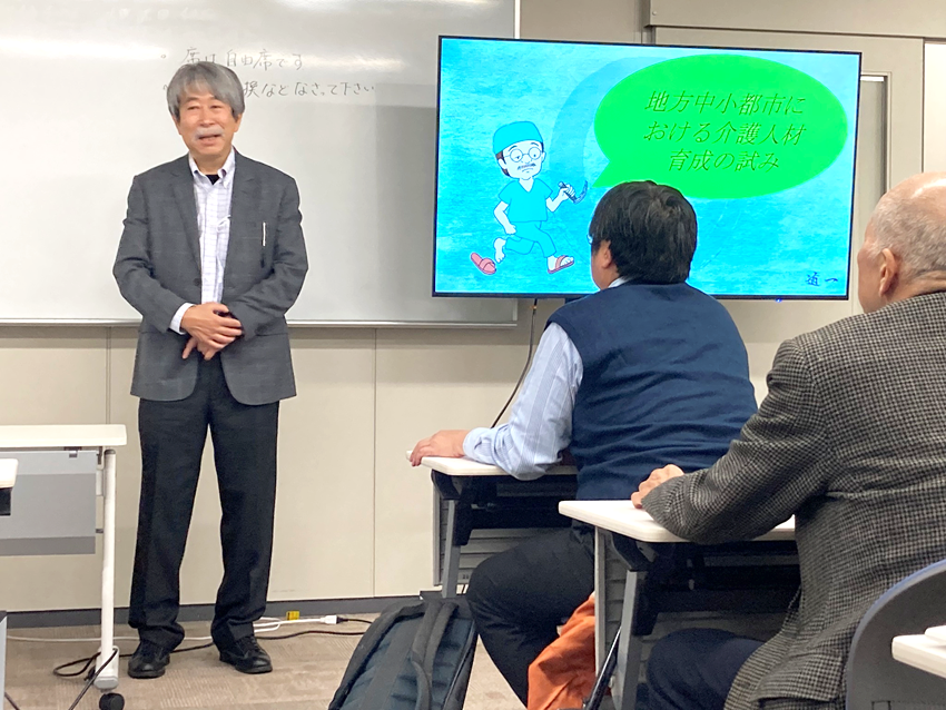 今回は、「地方中小都市における介護人材育成の試み」というテーマで、前回のオンラインに引き続いて内藤嘉之先生/益田市立介護老人施設くにさき苑施設長・社会医療法人愛仁会前理事長に御登壇いただきました。
