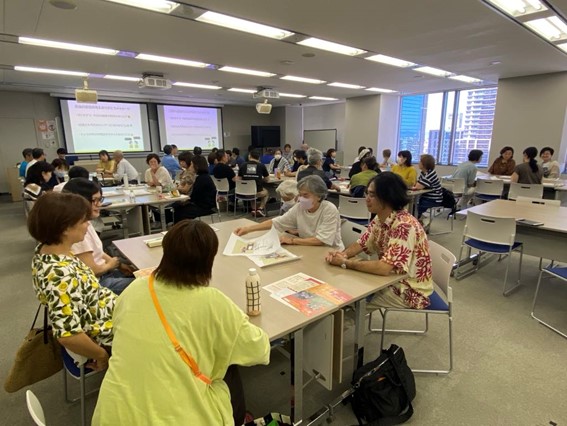 終了後の懇親会では、ご自身の仕事や活動、介護の現状など、自由に意見交換をしました。介護従事者の方とご家族の介護をされている方が語り合ったり、認知症を知ってもらうきっかけづくりとしてオレンジの花を植える活動をされている方がいたり、新たな出会いのきっかけになりました。