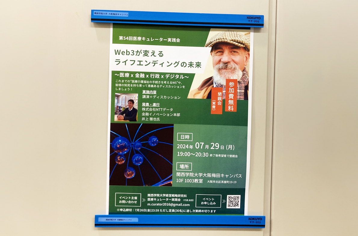 今回は、日本が抱える大きな課題である高齢化に関してデータの視点からみんなで議論しました。NTTデータの井上さんからの持ち込み企画で「Web3が変えるライフエンディングの未来〜医療 x 金融 x 行政 x デジタル〜」です。自社の技術シーズを使いつつ、社会課題も解決するという難題。しかしここに「うちの会社じゃなきゃできない、うちの会社こそやらないと」という真の差別化ができた時に、社会システムを変えるような技術革新、つまりイノベーションになるのだろうと思います。