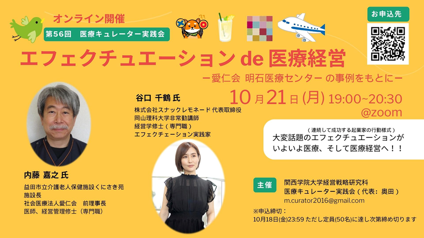 今回は「エフェクチュエーション de 医療経営」というテーマで、内藤嘉之先生/益田市立介護老人施設くにさき苑施設長・社会医療法人愛仁会前理事長と谷口千鶴さん/株式会社スナックレモネード代表取締役 に御登壇いただきました。