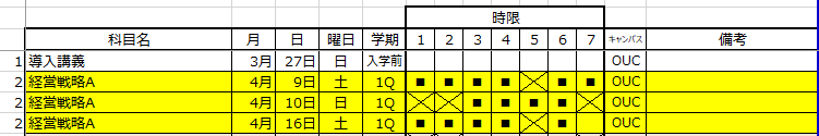 一方、他プログラム生と共に学ぶ合同科目(共通科目)は、通常の時間割同様、同じ曜日・時限で毎週(7週連続、8週目は補講・試験日)学ぶ形式となります(図2ご参照)。